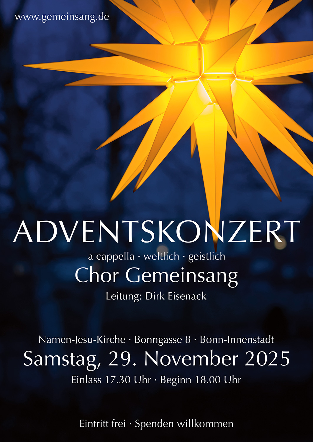 Adventskonzerta cappella • weltlich • geistlich Chor Gemeinsang Leitung: Dirk Eisenack Samstag, 29. November 2025 Namen-Jesu-Kirche • Bonngasse 8 • Bonn-Innenstadt Eintritt frei • Spenden willkommen |